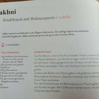 Ich habe mich an Jakhni versucht, einer Art Schmorgericht mit Rindfleisch in einer Wallnusspaste, was ursprünglich aus Kobuleti in der Region Adschariens kommt.